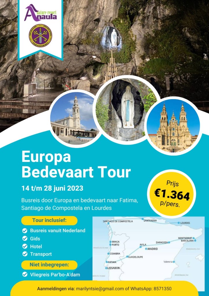 Van 14 t/m 28 juni 2023 wordt er een bedevaart tour in Europa gehouden. Met de bus naar de bedevaartsoorden Fatima, Santiago de Compostela en Lourdes. Voor informatie en aanmeldingen kunt u e-mailen naar Marilyn Tsie op marilyntsie@gmail.com of appen naar 8571350.
