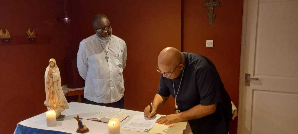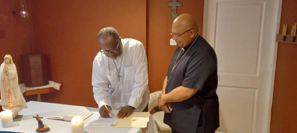 Bisschop Scantlebury gaf de zegen aan pater Charles en wenste hem succes toe in zijn nieuwe functie.