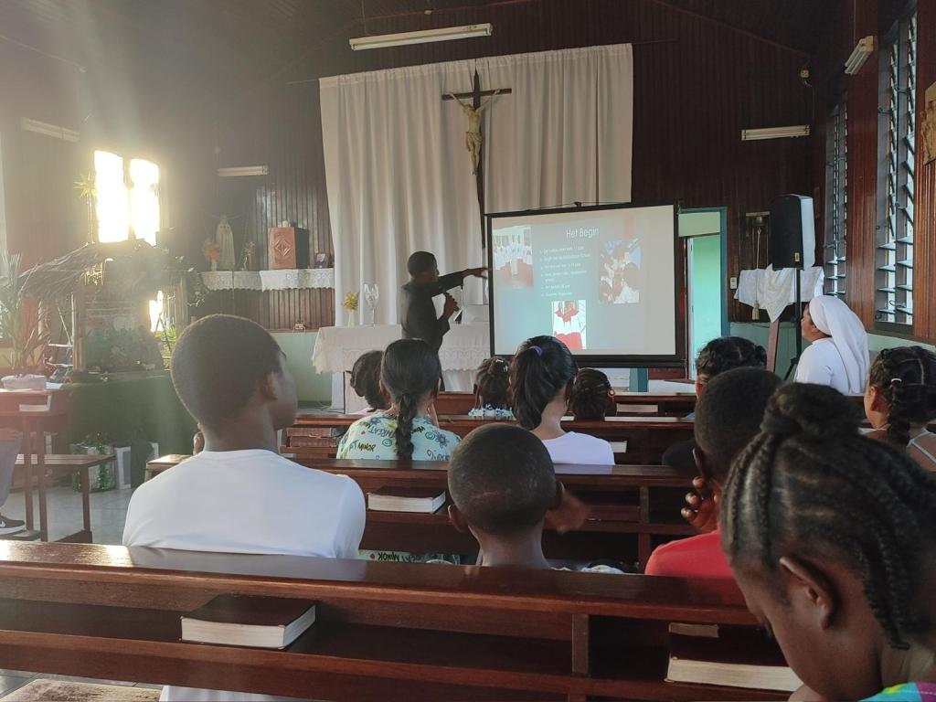 We begonnen met een vrolijke sfeer, een begroeting met het kruisteken en daarop aansluitend het Weesgegroet gebed. Zang mocht niet ontbreken en al gauw klonk het lied ‘Gi grantangi na Masra’ in de kerk. Vervolgens werden de jongeren in drie groepen gedeeld en kregen zij drie vragen: