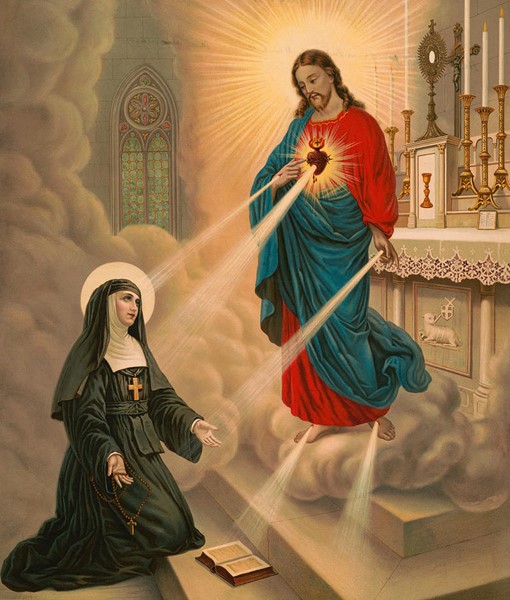 Enkele eeuwen later in 1670 vierde de H.Johannes Eudes voor het eerst het feest van het Heilig Hart. En rond diezelfde tijd in 1673 begon Jezus zich te openbaren aan een eenvoudige zuster in het Franse Paray le Monial, de H.Margaretha-Maria Alacoque. Zij was door God uitverkoren om de devotie tot het Heilig Hart grotere bekendheid te doen krijgen en officieel in de Kerk te laten installeren.