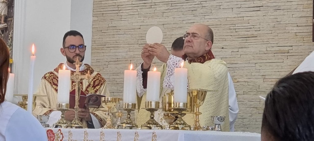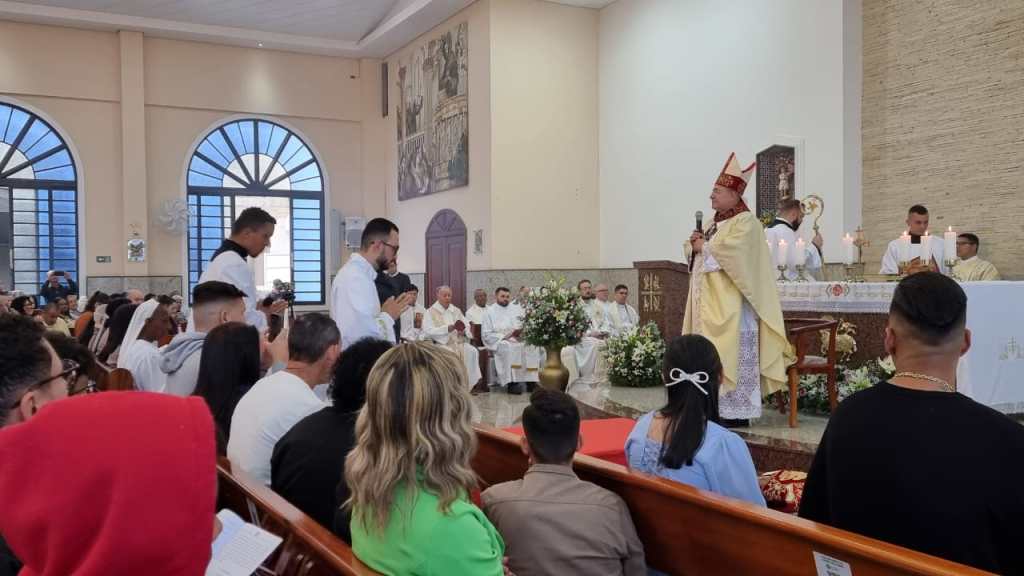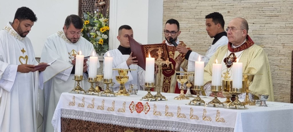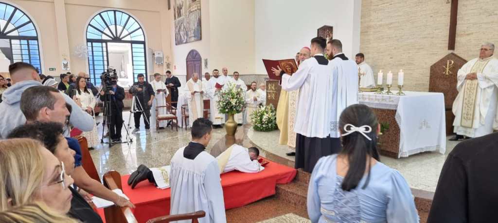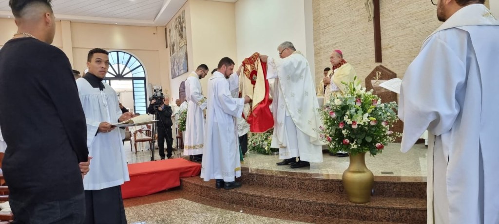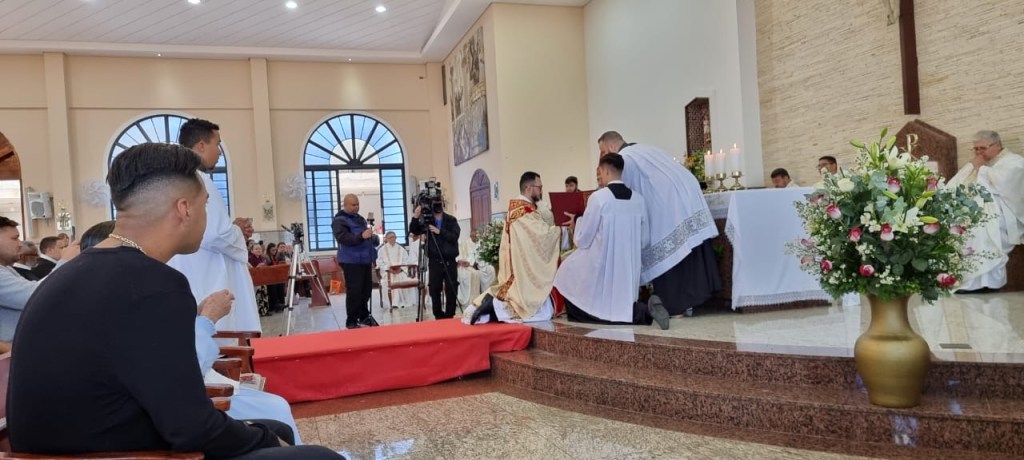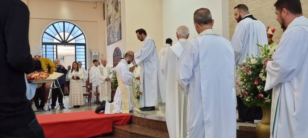 In de parochiezaal, op zaterdagmorgen 20 juli, staat een ontbijt klaar voor de gasten. Hoeveel er zijn, valt moeilijk te zeggen, maar onder de meer dan dertig priesters is ook aanwezig de provinciale overste van Aparecida, pater Marlos Aurélio da Silva, die recent nog in Suriname was voor een werkbezoek aan de Braziliaanse missie in Suriname. Tijdens de speciale eucharistieviering is één kant van de zaal voorin bezet door broeders en juniors van de congregatie van redemptoristen en religieuze mannen en vrouwen van andere ordes en gemeenten. De andere kant is bezet door de grote familie Dias, die net als de parochianen het grote moment van hun eigen Guilherme zijn komen vieren. Het door de neo priester gekozen motto voor de wijding is: ‘Omnia propter Evangelium’, wat betekent ‘Alles ter wille van het Evangelie’ (1 Kor. 9,23). Na de handoplegging zalft aartsbisschop Emilson Amador Caetano de handen van Guilherme. Het katoenen lint in zijn handen vangt de olie op, vervolgens geeft hij het lint aan zijn moeder, Eulinda Dias, en ontvangt zij als persoon de eerste zegen van de nieuwe priester. Zuster Judith die voor de ordenação was afgereisd, geeft een verklaring hiervoor: “Het lint bewaart de moeder en wanneer ze komt te overlijden, gaat het mee in haar doodskist. Hiermee herinnert ze aan God dat ze in haar leven een zoon heeft afgestaan.”