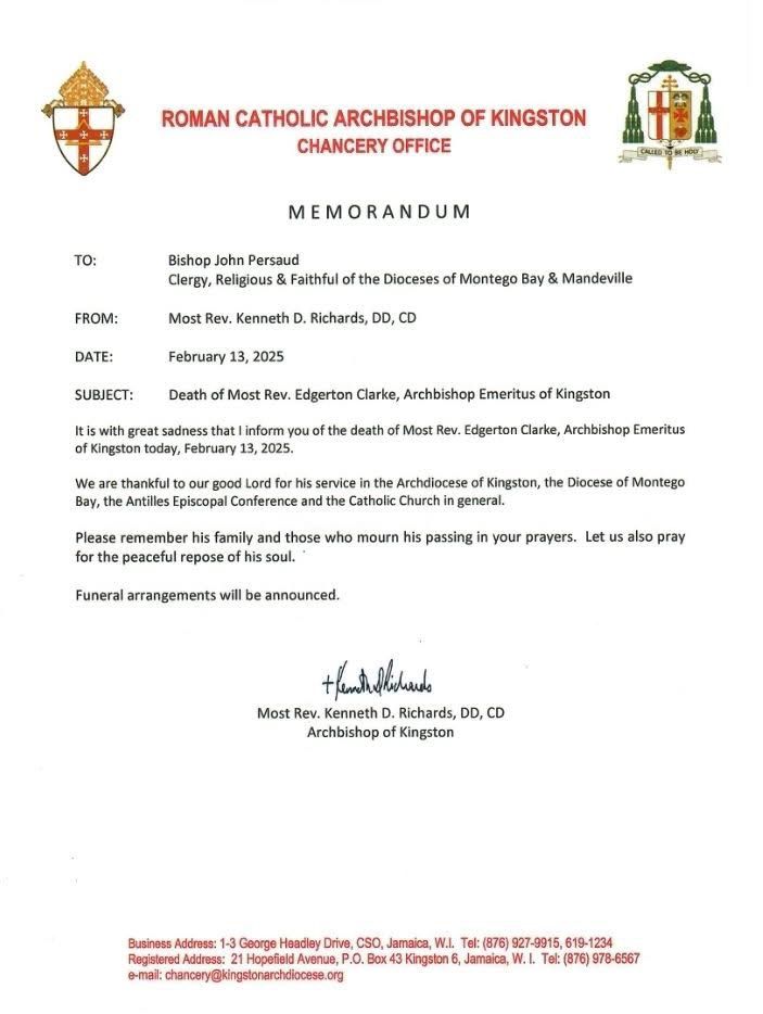 in een vandaag uitgegeven persbericht heeft de aartsbisschop van het bisdom Kingston, Jamaica, Mgr. Kenneth Richards, zijn diepe verdriet geuit over het overlijden van Zijne Hoogwaardige Excellentie Monseigneur Edgerton Clarke, aartsbisschop emeritus van Kingston, na een aantal maanden ziek te zijn geweest. Hij overleed vredig om 13.30 uur op donderdag 13 februari 2025, de dag voor zijn 96e verjaardag.