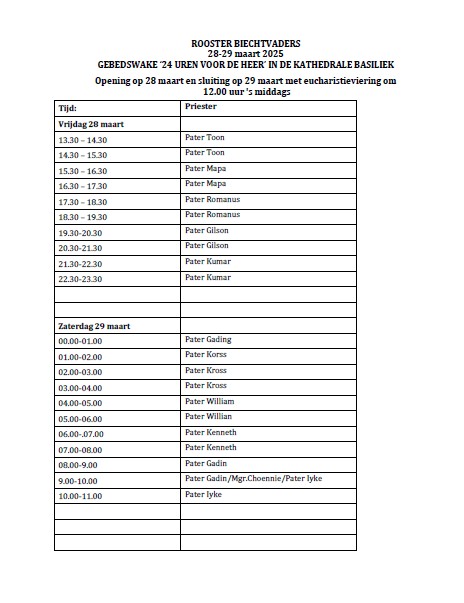 Hieronder vindt u het compleet programma van de gebedswake 24 uur voor de Heer en het biechtrooster. U bent allen van harte welkom!