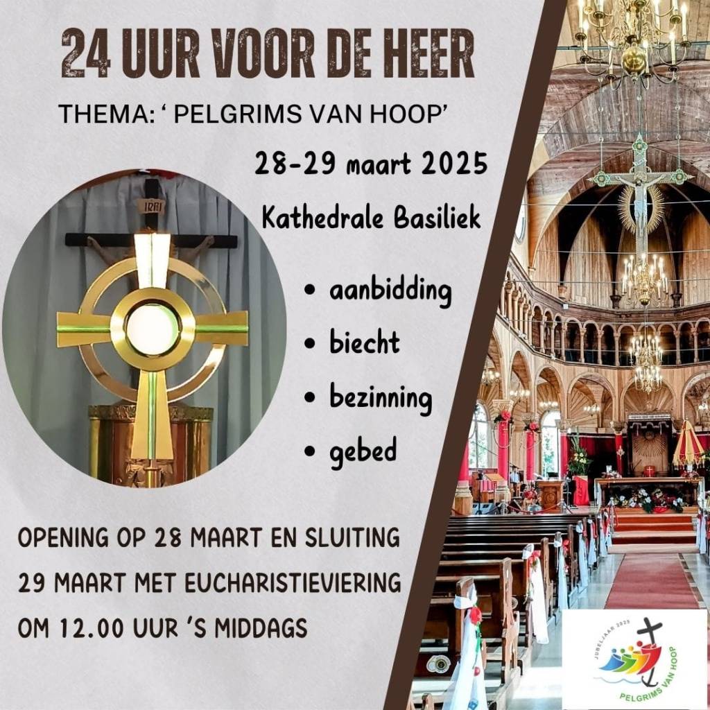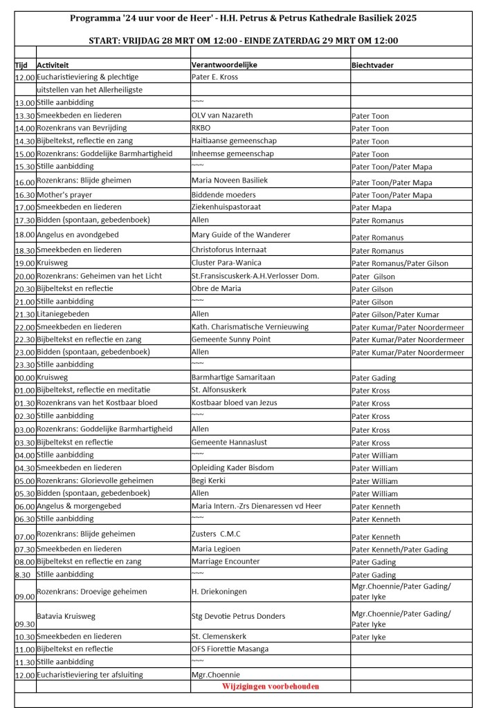 Vandaag, vrijdag 28 maart 2025, begint de gebedswake 24 Uur voor de Heer. In de kathedrale basiliek in Paramaribo zullen wij samen bidden, de Heer loven en prijzen – 24 uren lang! De gebedswake start met een eucharistieviering om 12:00 uur in de middag. Na de heilige mis vindt de uitstelling van het Allerheiligste plaats. Hierna zullen verschillende groepen en personen uit ons bisdom gedurende 24 uren de wake houden met smeekbeden, bijbelreflectie, het Rozenkransgebed, de kruiswegbeoefening en vrije gebeden. De gebedsvormen worden afgewisseld met momenten van stille aanbidding en meditatie. Tijdens de gebedswake zullen er ook priesters beschikbaar zijn voor de biecht.