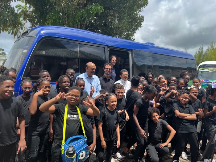 Wilfred Baldew (van Le Grand Baldew) en Jair Konter (Muziek Directeur) te midden van de docenten en studenten van de School voor Jong Talent.