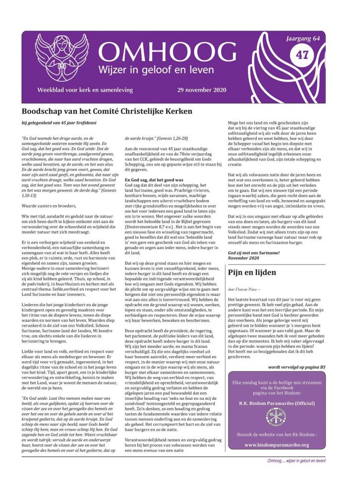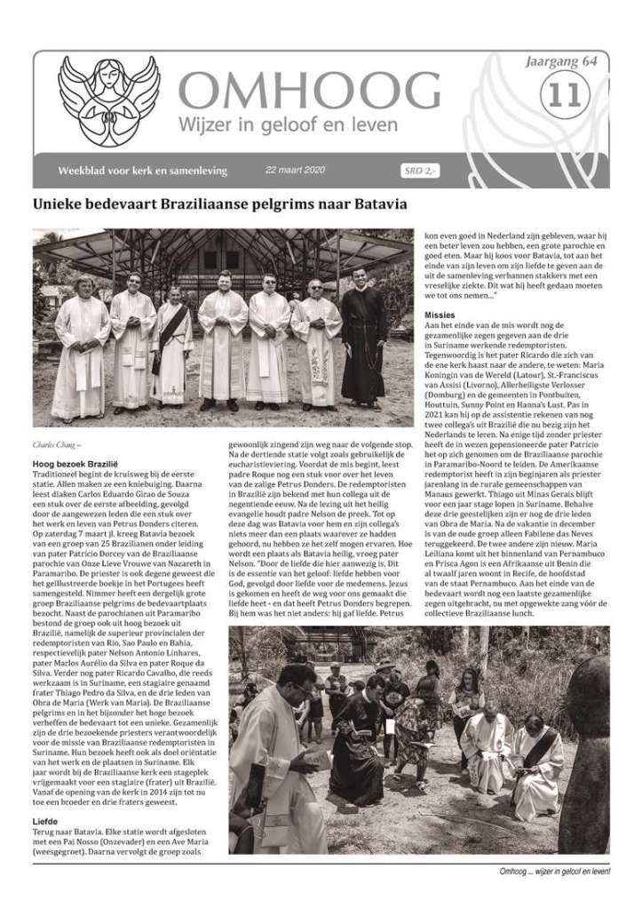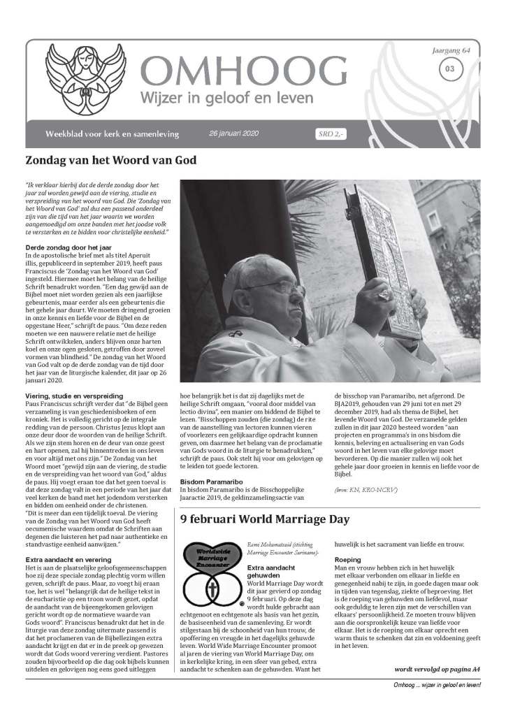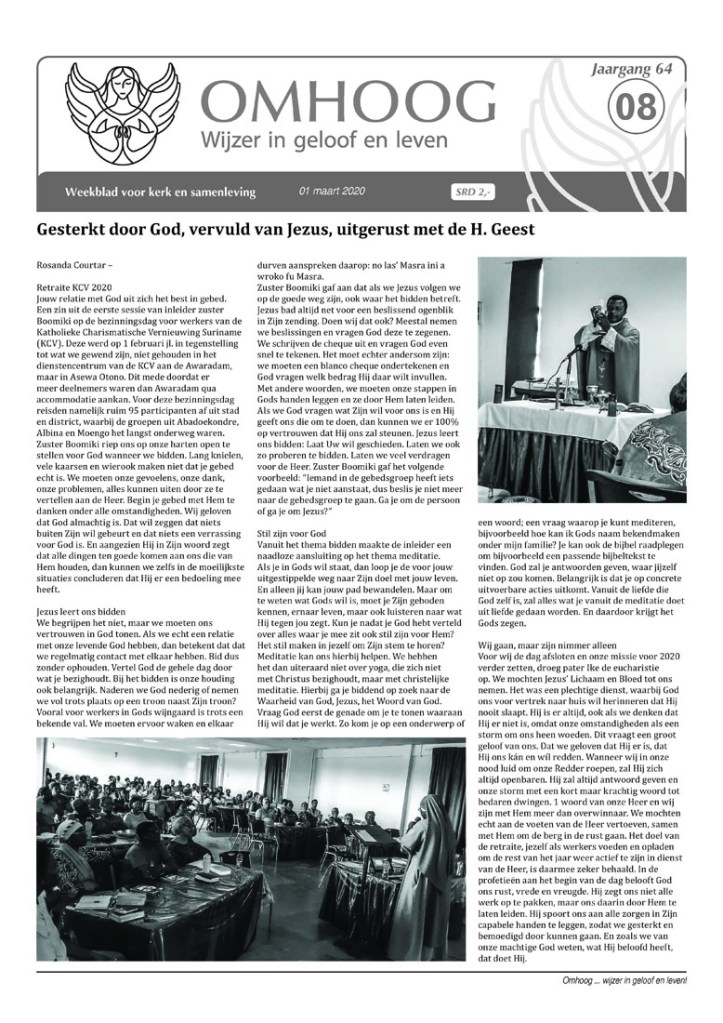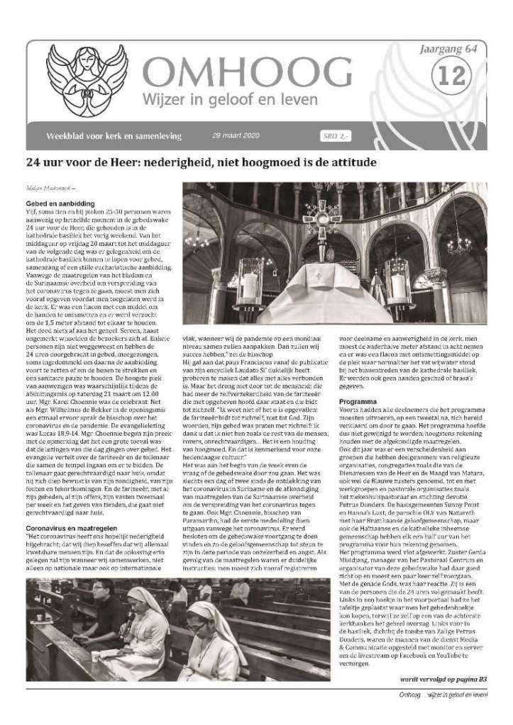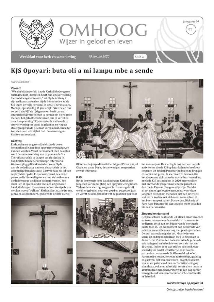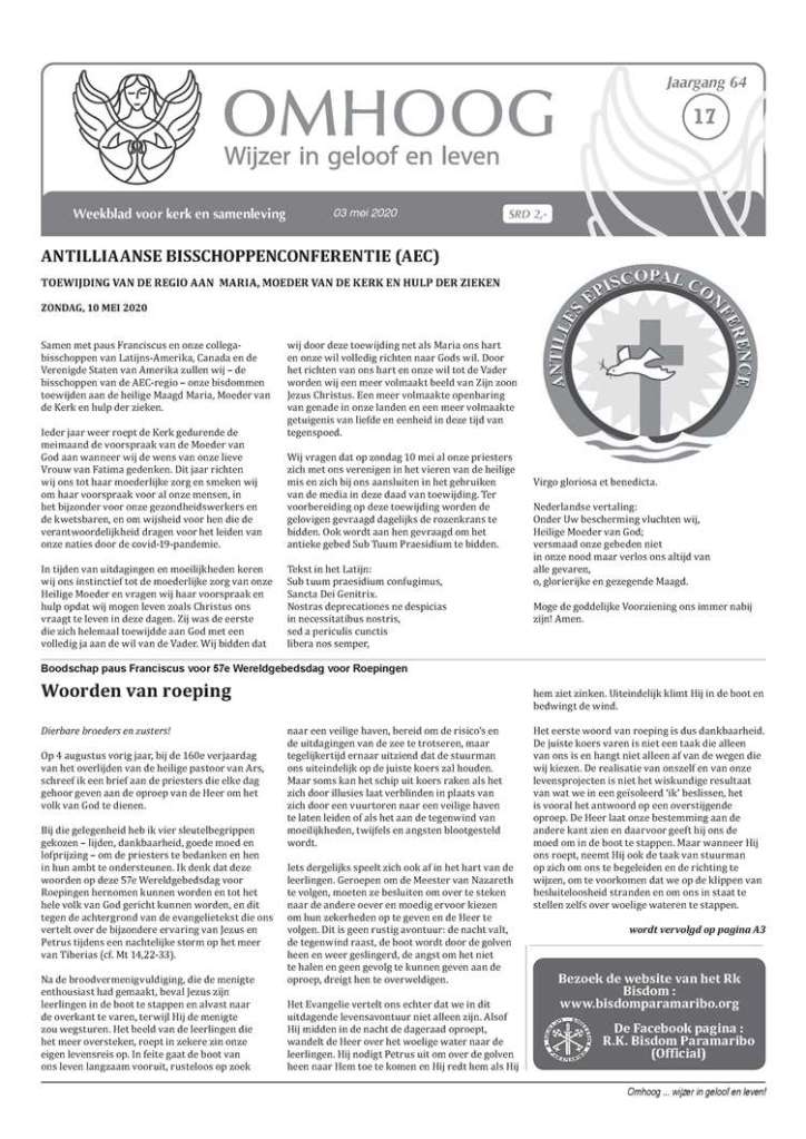 OMHOOG, het weekblad van het rooms-katholiek bisdom Paramaribo is elk weekend verkrijgbaar bij verschillende parochies en in de kerken voor SRD 2 per stuk.